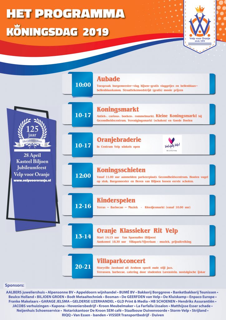 Net als de Koninklijke Bond van Oranjeverenigingen roept ook Oranjevereniging Velp voor Oranje iedereen op om met ideeën te komen om op Koningsdag 27 april toch een feestelijke sfeer te creëren in het dorp. Bijvoorbeeld door allemaal de vlag uit te steken. Een bloemetje brengen bij mensen in de zorg, de politie en andere zorgenden. Of misschien (heel ouderwets) met een geluidswagen door het dorp te rijden. Ideeën daarover kan iedereen mailen aan info@velpvoororanje.nl